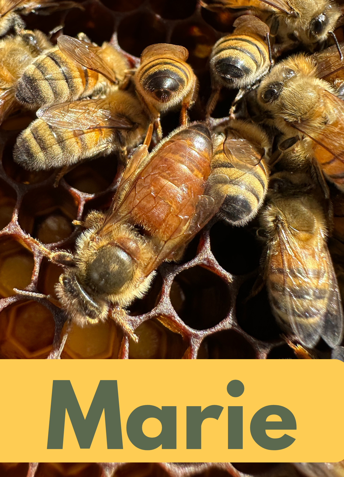 Queen Marianne is a vivacious monarch, and her bees take after their mother. Her hive benefits from their location: SCAN Land, a native wildflower habitat managed by the Scottsville Center for Arts and the Environment. The bees in Queen Marianne's hive forage and pollinate the wildflower habitat, ensuring it's beauty and longevity.